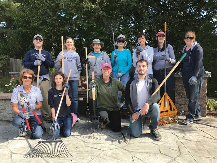 The Fredericksburg Regional Network and COAR Affinity Group got to work for the Into the Streets event. Back row: Donald Patterson MBA ’13, Elinor Tuhy ’10, Jeanine Meerscheidt, Prentice Einarsen ’92, Karine Close, Amanda Genter ’99, and Karen Thompson Lovas ’86. Front row: Patti Boise Kemp ’69, Emily Genter, Rebecca Heflin Chinn ’08, and Kevin Close.