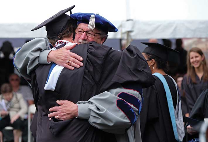 - Many happy graduates swap high-fives with the president, but for this one only a bearhug will do.