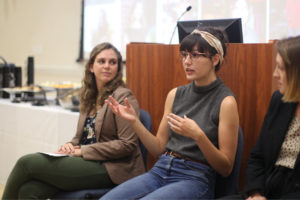 Paige McKinsey ’15, Sophie Mestas ’20, and Sam Carter ’14 spoke at the 10th anniversary celebration of the Women’s and Gender Studies program. (Karen Pearlman ’00)