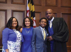 Kerwin A. Miller Sr. and Alethea “Lisa” Patillo Miller stand with daughter Alanna and son K.J. in the Maryland courtroom where Judge Miller presides. [Baltimore Sun Media. All Rights Reserved.]